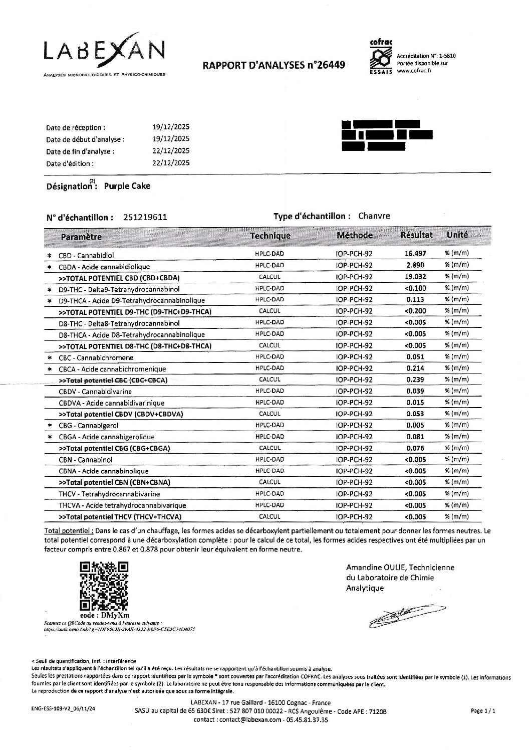 Les analyses de laboratoire sont fournies par les producteurs.